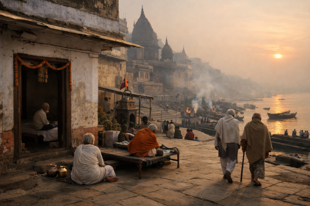 Another reason availability is scarce is the cost—or rather, the lack of it. Mukti Bhawan is not run for profit. The stay is symbolic in price, sometimes only a few rupees a day, because no one should be denied salvation due to money. This openness means that a wealthy traveller and a retired labourer could be knocking on the same door for the same purpose. In luxury hotels, money sorts people; here, mortality does. It creates a kind of equality that is unsettling yet strangely human: at the end, every life stands at the same distance from death.