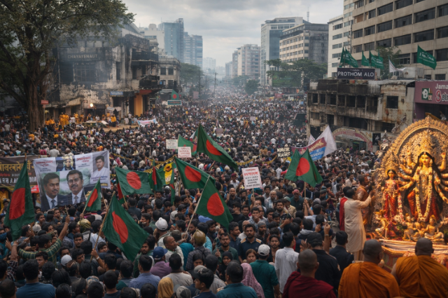The most important among these - in the research of Eminence Associates for Social Development, the opinions of 20000 people had been collected from 300 parliament seats. 70% people had said, they were in favour of BNP. The anti - Hasina, newly established students organisation NCP leaders including Hasnat Abdullah had always been strongly anti - Indian. In spite of creating all these anti - Indian sentiment throughout the nation, only 2.6% people had shown their support for NCP, according to the research ! 19% people had supported Jamaayet Islami. The Khaleda - close businessman Abdul Awal Mintu whose probability to become the business minister of Bangladesh was in the air, said, "A powerful circle doesn't want the election to happen at the right time. An unelected administration will be of much benefit for their vested interests. They are getting the maximum benefit out of the anarchy, the country is going through." A section of BNP thought, allowing Awami League to fight in the election would be good for democracy. Mintu continued, "Our leader Tarique Rahman said in his speech, about creating a nation with all the parties. He didn't say a word against Sheikh Hasina and Awami League. He didn't oppose India. In the past, his father, Jiaur Rahman had formed the nation with all the parties." According to him, it was not difficult to understand that putting the onus of Osman Hadi's murder on BNP and committing the murders and anarchy with that excuse was the plan for a larger conspiracy. Because after winning majority in the election, BNP wouldn't want to include Jamaayet Islami into the 'unity government'. Probably for this reason, Tarique Rahman and his party had become extra careful about the minority vote. The parliamentarian of Manikganj and the former industry minister of Khaleda regime, Shamsul Islam Khan's son, Moinul Islam Khan Shanto was holding meetings with the Durga Puja committees of his Hindu majority area. His chance of winning a ministry in the BNP government was maximum. He somehow managed time within his busy campaign schedule and said, "Here in Majhipara, the Hindus throw huge treat during poush sangkranti. But the Muslims also celebrate that occasion with great fun. I see everyone as Bangladesh citizens. These people wanted development before. Now they say, they want to sleep in peace. There are so many people in my constituency who are honest and work hard. But they have the stamp of Awami League on them. They are coming to us now, as they are in distress. We are moving ahead, taking them with us. BNP doesn't believe in the politics of murder and setting fire."