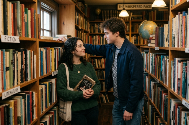In a quiet corner of a bookstore, where the scent of paper lingers like a memory and time seems to slow its restless pace, a fleeting moment unfolds—soft, intimate, almost whispered into existence. Amid rows of neatly arranged books, two young individuals find themselves suspended between curiosity and connection, as though the world beyond those shelves has gently faded away.