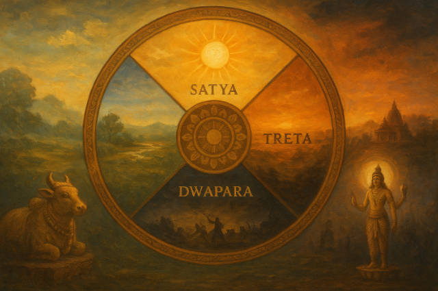 Dwaparayuga, the third age in a cycle, lasts for 8,64,000 2,400 years, and its main period lasts for 72,000 years, and its two twilights each last for 72,000years. Dwaparayuga is derived from the Sanskrit term dwa, which means two, and apara, which means after; therefore, dwaparayuga means the age after the two. As per Bhagavata, during this age, the dharma bull, which represents morality, stands on two legs, Daya and Satya. Dwaparayuga is described in the Mahabharata, Manusmriti, Surya Siddhanta, Vishnu Smriti, and various Puranas. In this era, the divine intellect ceases to exist, and it’s therefore seldom that anyone is wholly truthful. As a result of this life of deceit, people are plagued by ailments, diseases, and various types of desires. After suffering from these ailments, people realize their misdeeds and perform penance. Some also organize Yajnas for material benefits as well as for divinity. According to the Puranas, this yuga ended when Krishna returned to his eternal abode of Vaikuntha. There are only two pillars of religion during the Dwaparayuga: compassion and truthfulness. Vishnu assumes the color yellow, and the Vedas are categorized into four parts: Rig Veda, Sama Veda, Yajur Veda, and Atharva Veda.