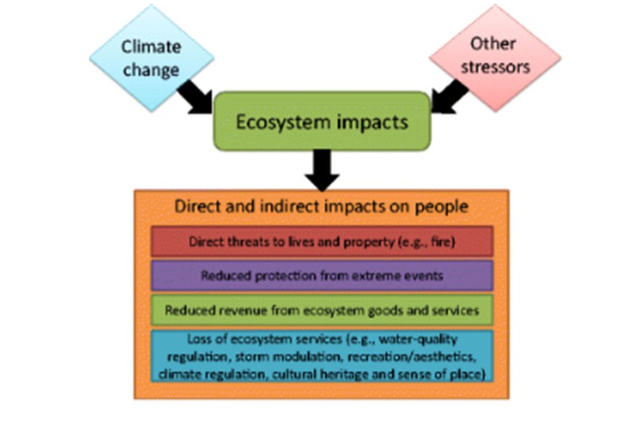 Climate change is having a profound impact on eco system worldwide, effects on changing precipitation Patterns ( shifts rainfall and drought patterns, ENSO], shifts in species distribution, distrupted migration pattern etc. Coral bleaching, polar ice melt and drought-impacted forests are the main effected region. Ecosystem gives services such as bio diversity, which provides services like air and water filtration, soil formation and climate regulation. But it is collapsing, disease risk is increasing, soil degradation, decreased water quality,