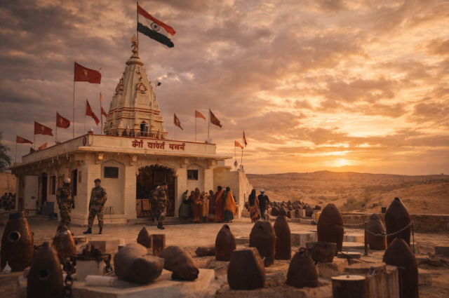 Border Security Force (BSF) of India took over the Management and Protection of the Tanot Mata Temple today because of its historical significance. Every Soldier stationed there carries a pinch of sand in his hands as a protective shield during duty. The temple is now open again for visitors and worshippers after the border tensions have eased.
